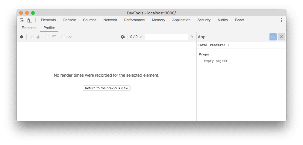 If the selected component did not render at all during the profiling session, the following message will be shown:
